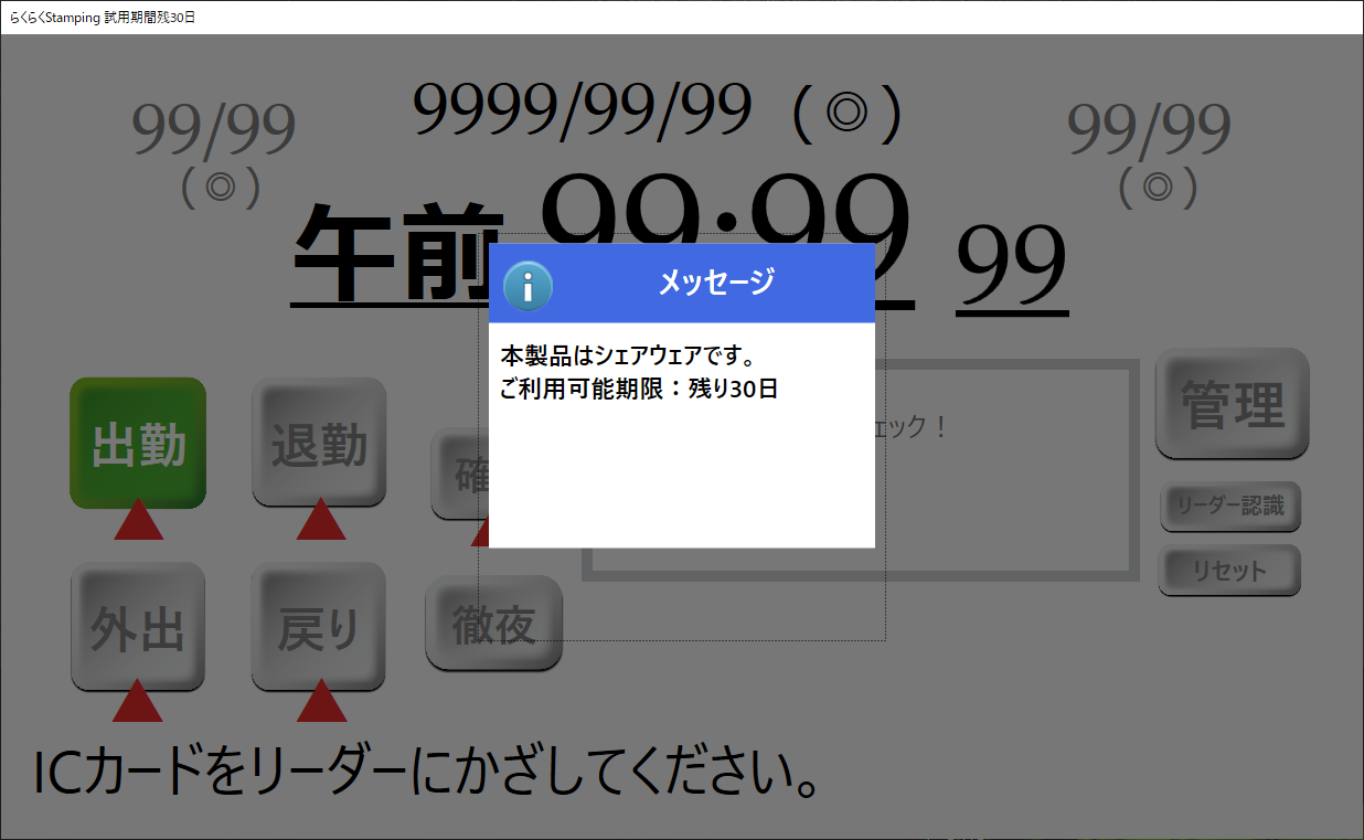 試用中は左記のように、起動時に試用であることをお知らせします。また画面左上のアプリ名横に残りの試用日数を表示しています。